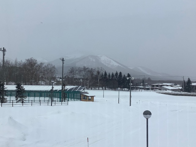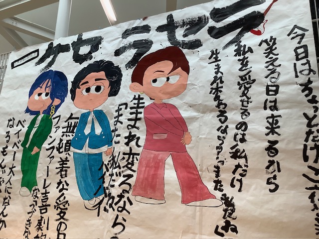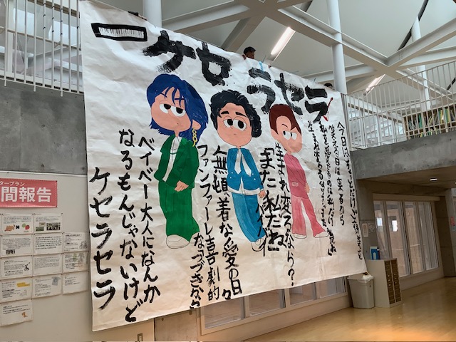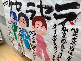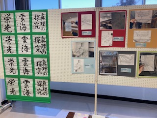 本日(28日)は、細かな雪の舞う一日です。校内ハンノキモールに、巨大な作品が展示されました。これは、第1弾でも紹介いたしましたが、弟子屈町地域コーディネーターによる町内小中学校間での「展示交流」企画として実施しているものです。今回は、弟子屈小学校から「パフォーマンス書道」による作品を展示しています。迫力ある作品をご覧ください。