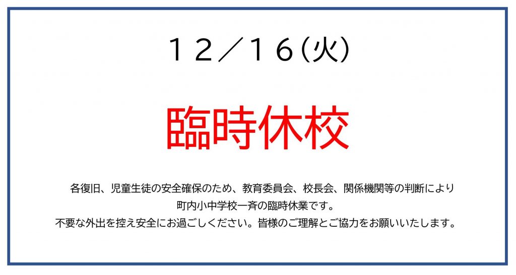 本日(16日)は、天候は回復いたしましたが、 昨日の暴風雪警報発令による臨時休校に引き続き、湿った重い大雪による影響を受け、生徒の登下校・スクールバス運行に向けた安全確認、復旧作業を行うため、弟子屈町内の小中、高校とも臨時休校の措置となりました。早朝より教職員による除雪作業を行い、明日からの学校再開、生徒の登校に備えています。