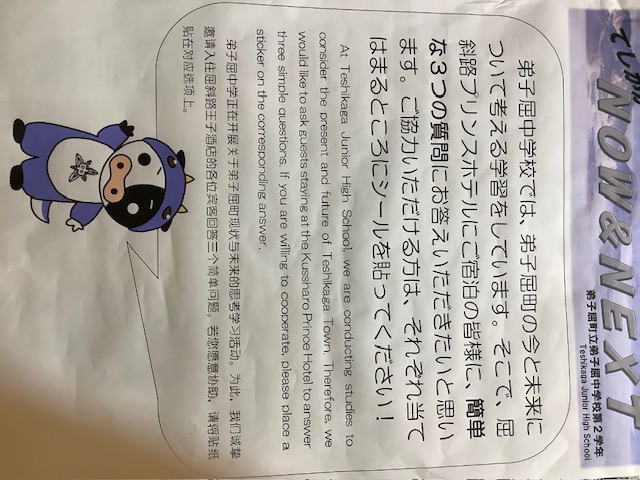 現在、2年生では、今月末に予定されている宿泊研修に向けて準備を進めています。本日は、2学年の先生方が宿泊先の屈斜路プリンスホテルに事前調査用の掲示物を持参して打ち合わせを行っています。若干の手直しが必要となり、来週月曜日からの宿泊者を対象にチェックインの際に合わせて事前調査を開始予定です。