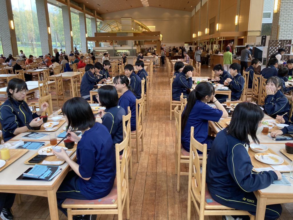 2学年シン宿泊研修は朝食を終え、身支度後、本日の調査地 美幌町に移動いたします。参加生徒は体調不良者なく、しっかりバイキング朝食を堪能しています。昨日の津別町の調査同様、美幌町での調査活動内容に期待されます。宿泊した屈斜路プリンスホテルでの宿泊者アンケート結果も大変興味深いもので、この後の分析、考察が楽しみです。