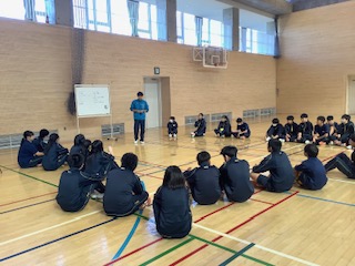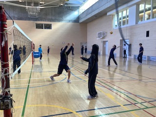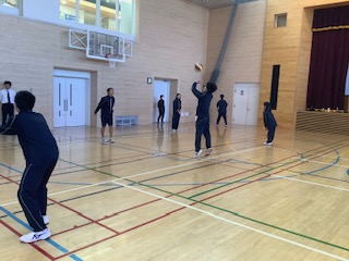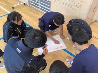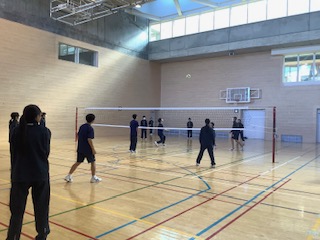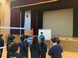 本日(24日)の一本は、2年の体育です。 単元は「バレーボール」です。この授業は、本校研修部が進めている全教員が行う校内公開研究授業を兼ねています。パス・サーブ・レシーブ等の基本練習の後、ゲームを行っています。本時の課題「効率よく得点をするために必要なプレーは何か」です。ゲーム後は、チーム毎に、課題解決に迫ることを勝敗よりも重視してリフレクションを行っています。 昨日の3学年同様、 全体が競技を楽しみながらも整然と流れるように授業が展開されています。