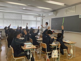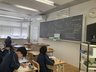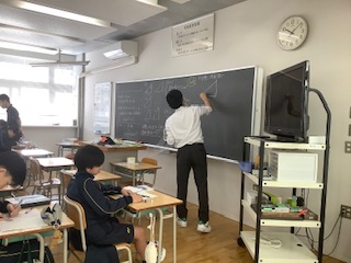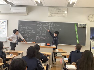 本日(27日)の一本は、2年の数学です。 単元は「平行と合同」です。この授業は、本校研修部が進めている全教員が行う校内公開研究授業を兼ねています。 本時は、最初の問いとして「1辺12㎝の同じ三角形を買ってきてもらうために、どのような説明が必要か?」の問いに迫っていきます。この学びを「三角形の合同条件」に結び付けていく意図が伺えます。授業も学級全体で学び合う姿勢が見られています。