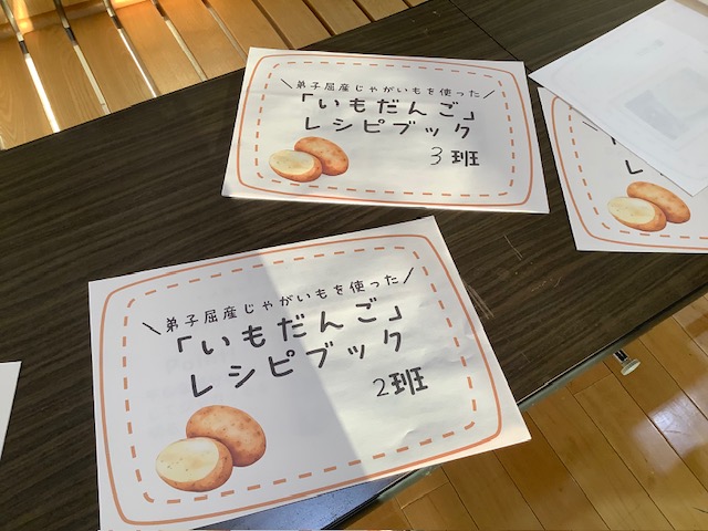 本日(28日)放課後、玄関ホールに昨日、1年生で実施した「いもだんご」調理実習による成果物『弟子屈産じゃがいもを使った「いもだんご」レシピブック』が完成、展示されています。6グループ毎に作成していますので、調理にあたってポイントなど視点がそれぞれ異なっており、見比べてみると大変楽しいものとなっています。ぜひ、来校の際にご覧ください。