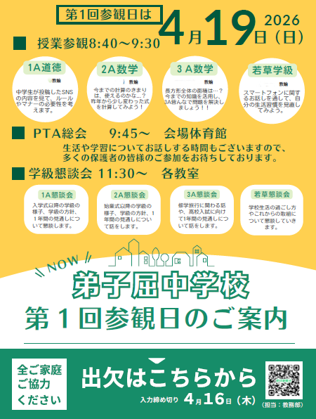 19日(日)には、第1回目の参観日と懇談会が予定されています。授業参観後には、PTA総会が体育館にて開催します。参加集約は、明日(16日)までとなっております。多くの保護者の皆様の来校をお待ちしています。