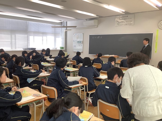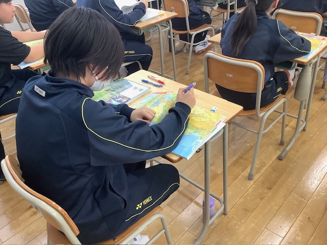 本日(16日)の「本日の一本」は、 1年生の社会科です。 中学校では、小学校とは異なり、社会科も地理的分野・歴史的分野・3年生で学ぶ公民的分野に分かれます。本日は、今後、地理的分野の学びを進める上で欠かせない、地図帳の「検索」作業に取り組んでいます。